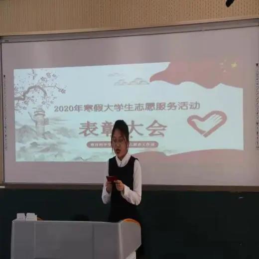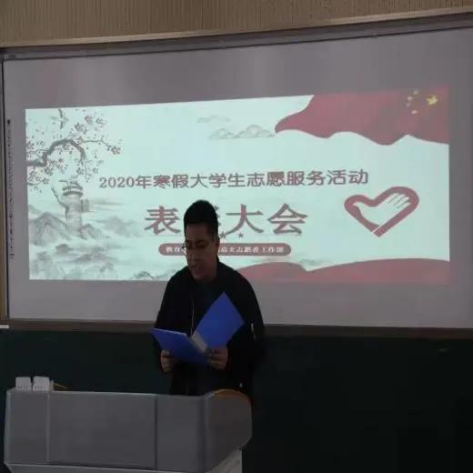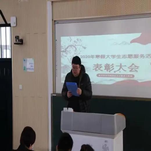 会上,辅导员关天宇宣读了《关于表彰教育科学学院2020年寒假防疫优秀志愿者的决定》,辅导员梁君宣读了《关于表彰教育科学学院2020年寒假“七彩假期 筑梦远航”支教活动“先进个人”、“优秀个人”的决定》,并为获奖志愿者代表颁发了荣誉证书。